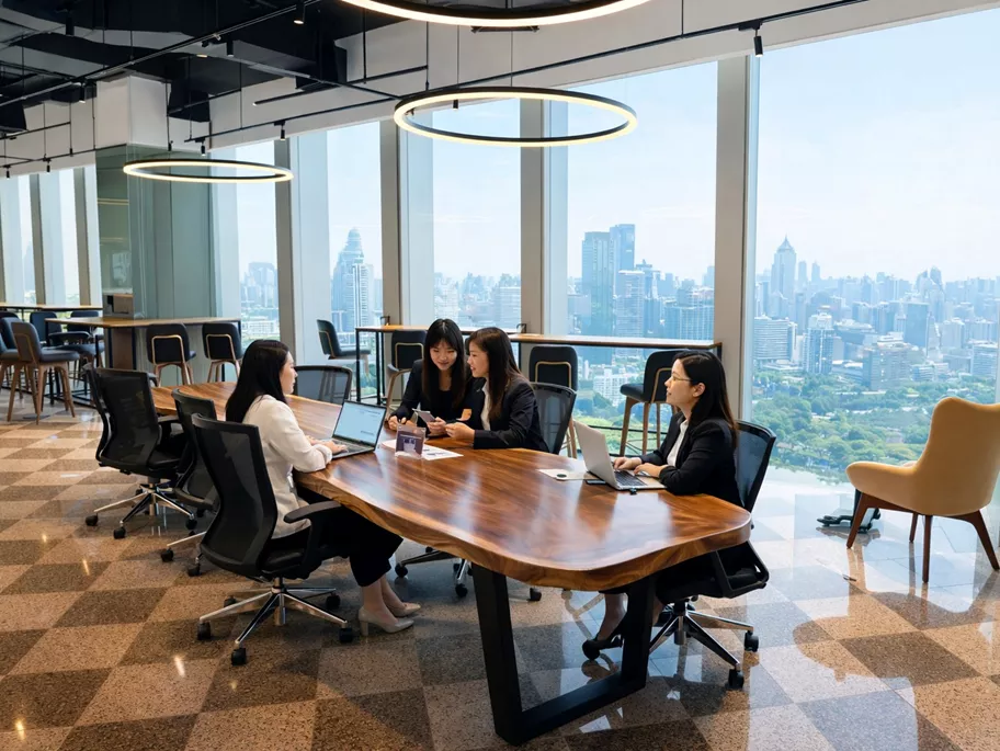 Located on Level 35 of the newly built Dusit Central Park, this space has been designed with attention to detail and with the modern business in mind. The space contains a spacious reception area and pantry finished in high-quality materials, surrounded by natural light and expansive views of Lumpini Park. The workspace features high ceilings, flexible seating, meeting rooms, and a curated business lounge with pantry access, making it one of Bangkok’s most sophisticated environments for flexible work.